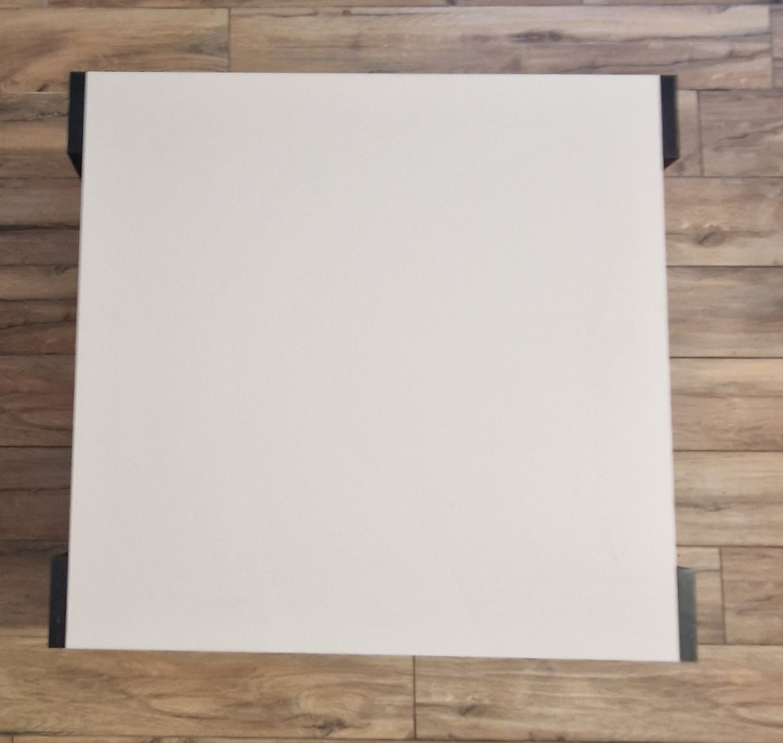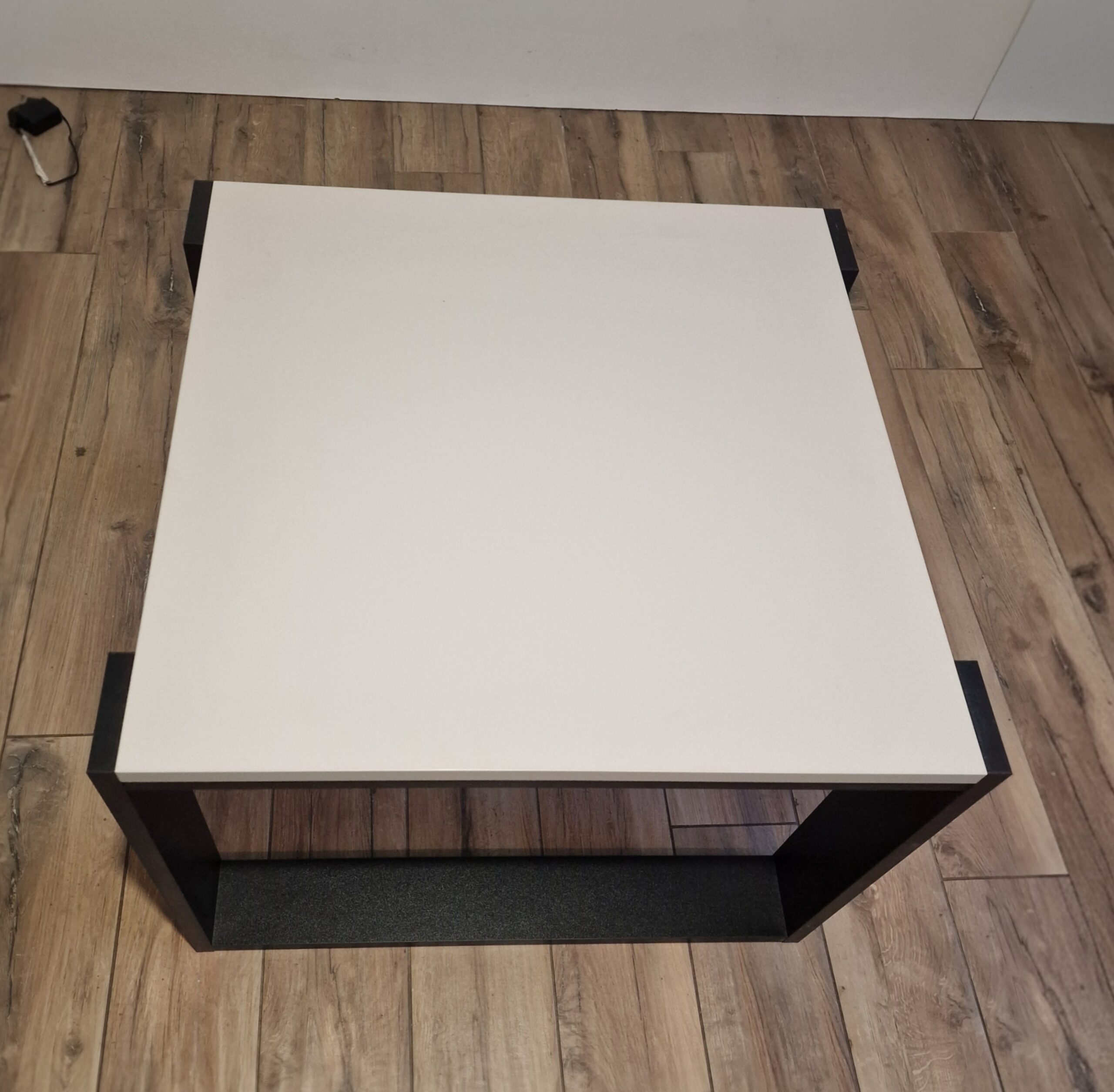 Stolik jest wykonany z płyty akrylowej Egger Kaszmir U702 Perfect Sense 18 mm matowy. Krawędzie oklejane metodą airTec. Podstawa Kronospan Czarna 0190 PE- Oklejony PCV o grubości 0,6 mm. Dzięki swojej strukturze jest bardzo odporny na zabrudzenia i zarysowania.